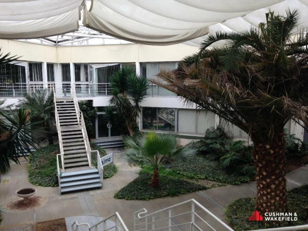 Accès aux bureaux situés au premier étage par un patio intérieur paysagé