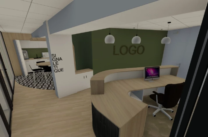 L'aménagement prévoit un bureau de direction, deux bureaux indépendants, une salle de réunion, une salle repas, deux accueils et des locaux techniques.
