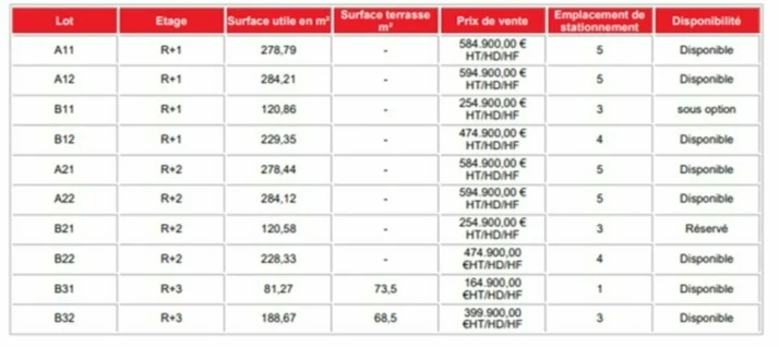 | Lot | Etage | Surface utile en m² | Surface terrasse m² | Prix de vente | Emplacement de stationnement | Disponibilité |