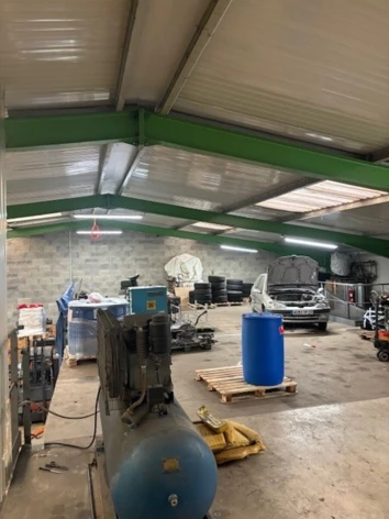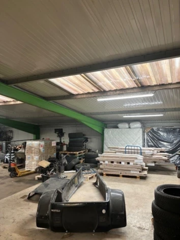 - Atelier : Type de construction : Charpente métallique. Type de bardage : Bardage double peau - Éclairage : zénithal - 2 portes sectionnelles motorisées. Surcharge de la dalle : 1T/m². - Hauteur sous crochet : 6 m - Électricité : 220 V. Mezzanine bois sur structure IPN (surcharge 250 kg / m²)