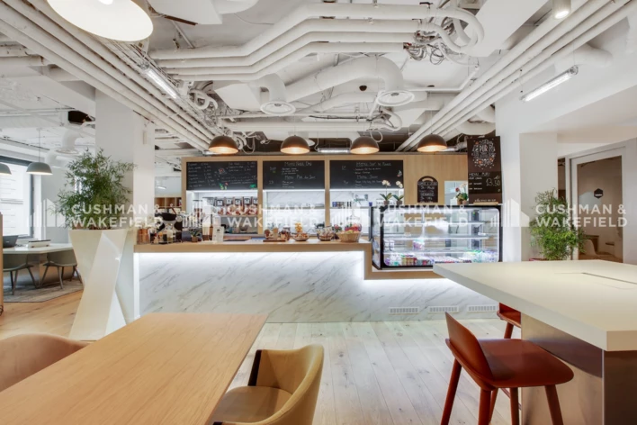 Les espaces de travail et de convivialité dévoilent des tendances modernes et chaleureuses avec un accès à un terrasse offrant des vues de toute beauté sur Paris.