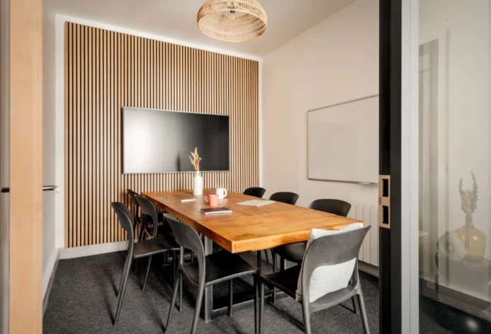 Découvrez un plateau de bureaux lumineux et intimiste, aménagé en deux bureaux, une grande salle de réunion/ salle à manger, un petit espace détente avec une petite salle de réunion vitrée.
