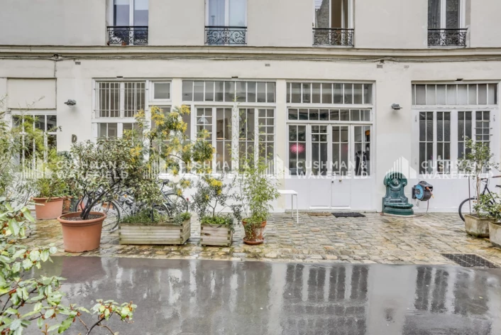 Niché dans une majestueuse cour industrielle arborée cet espace de bureaux est baigné de lumière grâce à ses grandes baies vitrées.