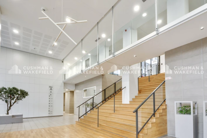 L'espace de coworking Villeurbanne est situé au 4ème étage d'un bâtiment moderne, dont les espaces de bureaux sont organisés autour d'un vaste patio central.
