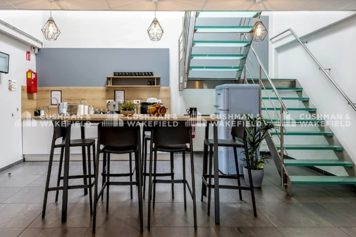 Les espaces communs sont aménagés pour faciliter les rencontres entre les coworkers. L'espace dispose d'une cuisine centrale, ainsi qu'un petit salon à l'accueil. La lumière naturelle est apportée à la fois par l'entrée et par un puits de lumière au-dessus de la cuisine, ce qui fait de cet espace le coeur battant de l'espace.