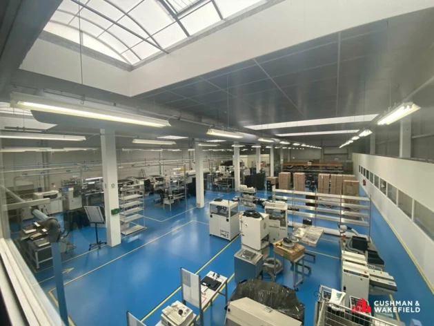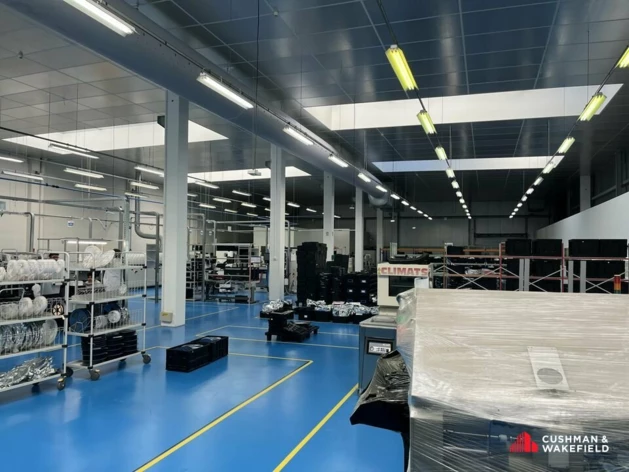 L'ensemble se compose :d'un entrepôt de 1 100 m² avec 5 m sous plafond.de bureaux en R+1 de 200 m²1 quai de livraison 1 porte sectionnelle Trappe de désenfumageSol ESD Climatisation 15 places de parking
