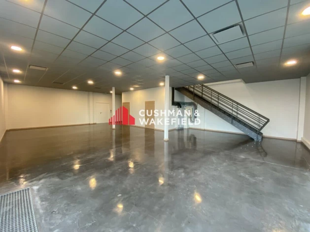 - en RDC : 150 m² de surface showroom avec vitrine, deux entrées piétonnes, sanitaire PMR, une douche, 2 accès dépôt + 300 m² de surface dépôt avec 1 porte sectionnelle motorisé et 1 issue de secours,