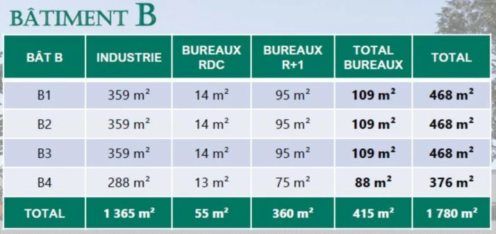 | Bât B | 361 m² | Bureaux | Nous consulter | ||