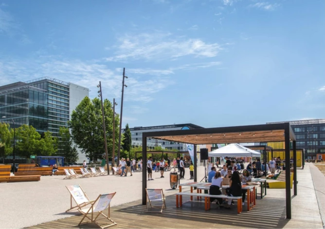 Le parc est certifié ISO 14001 et labellisé « Parc d'Excellence », témoignant de son engagement envers l'environnement. Il offre une multitude de services pour le bien-être des occupants : 13 points de restauration variés, crèches, pôle santé, espaces de co-working, salle de sport avec coaching, piste d'athlétisme, potager partagé, espace zen et conciergerie digitale. Une Happiness Manager est dédiée à l'animation de la vie du parc, soutenue par une plateforme digitale communautaire accessible via www.cyg-icade.com.