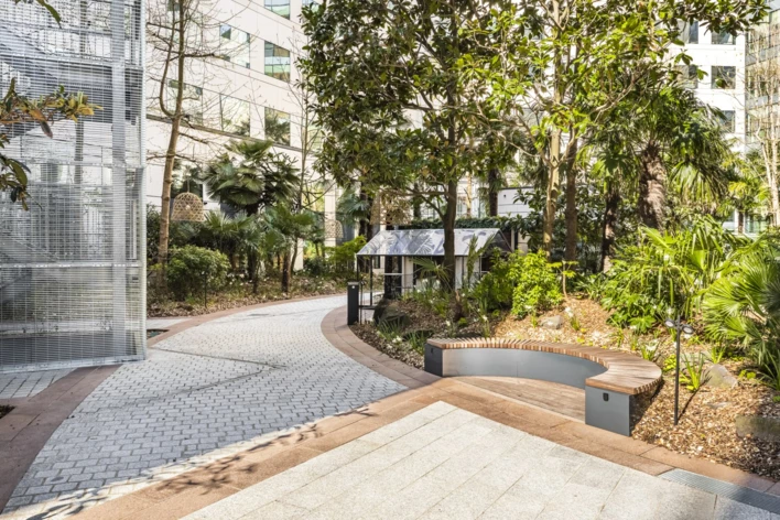 L'immeuble, code du travail, se compose de 3 bâtiments articulés autour d'un vaste jardin intérieur avec des espaces aménagés pour le bien-être des occupants.