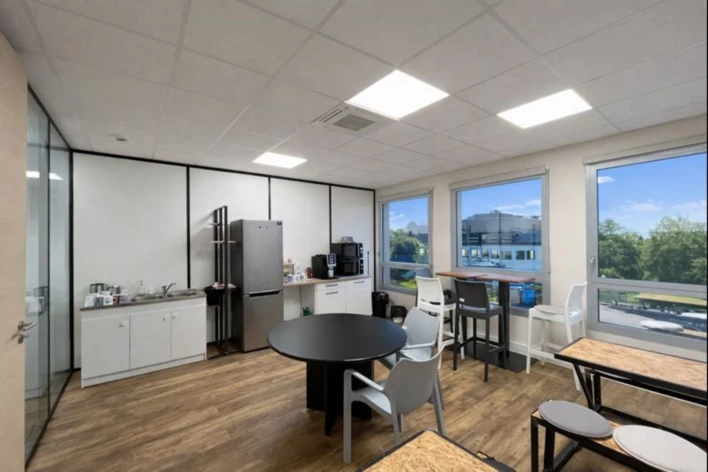Les locaux se composent d'une grande salle de réunion, de deux open spaces favorisant le travail collaboratif, de six bureaux fermés offrant calme et confidentialité, ainsi que d'une cuisine aménagée pour le confort des occupants. La répartition des espaces permet une utilisation optimale des surfaces pour différents modes de travail.