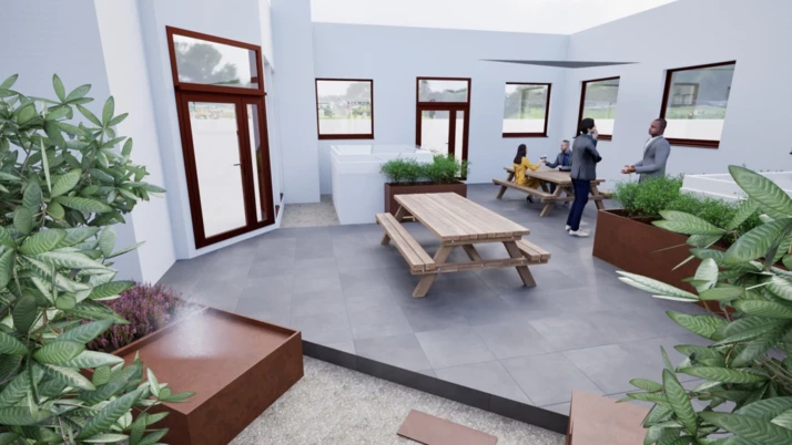 Patio commun exterieur, meublé et aménagé pour les beaux jours