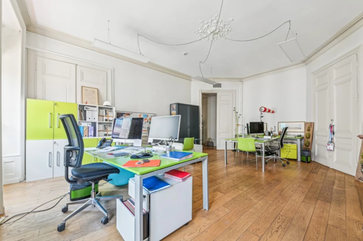D'une surface totale de 206 m², le plateau offre un cadre de travail à la fois élégant et fonctionnel, alliant le charme de l'ancien et les exigences du tertiaire moderne. L'espace se compose de plusieurs bureaux fermés, d'espaces ouverts facilement modulables selon les besoins, ainsi que d'une salle de réunion conviviale. Les prestations incluent une belle hauteur sous plafond, de grandes fenêtres apportant une excellente luminosité, et des finitions soignées qui renforcent le caractère prestigieux du lieu.