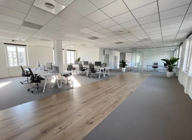 Les surfaces disponibles, totalisant 625 m² divisibles à partir de 310 m², offrent un cadre de travail confortable et fonctionnel au sein d'un immeuble en R+5 de très bon standing. Les plateaux bénéficient d'une climatisation réversible, d'un faux plancher technique, d'un faux plafond et de prestations haut de gamme permettant une installation rapide et une exploitation optimisée. Les circulations, les espaces communs et les deux ascenseurs - dont un adapté PMR - assurent un confort quotidien, tandis que la présence d'une crèche en rez-de-chaussée renforce la praticité de l'ensemble pour les entreprises.