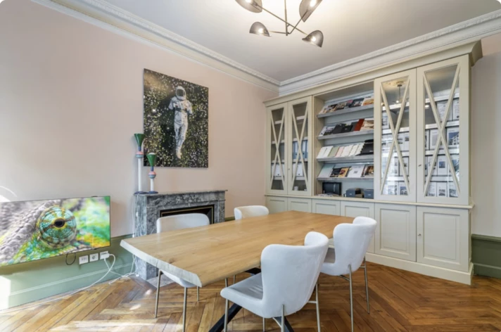 Les locaux bénéficient d'une climatisation complète, garantissant un confort optimal tout au long de l'année. La belle hauteur sous plafond, les moulures d'époque et la lumière naturelle confèrent à l'ensemble un caractère à la fois authentique et moderne, idéal pour accueillir une activité tertiaire, un cabinet de conseil ou une structure de services.