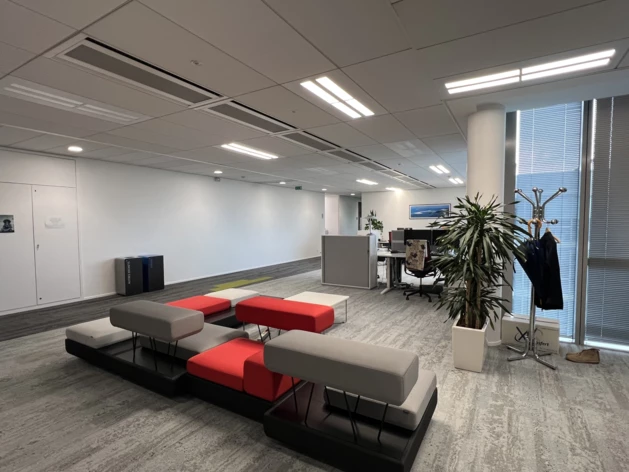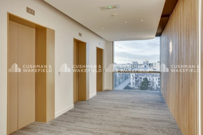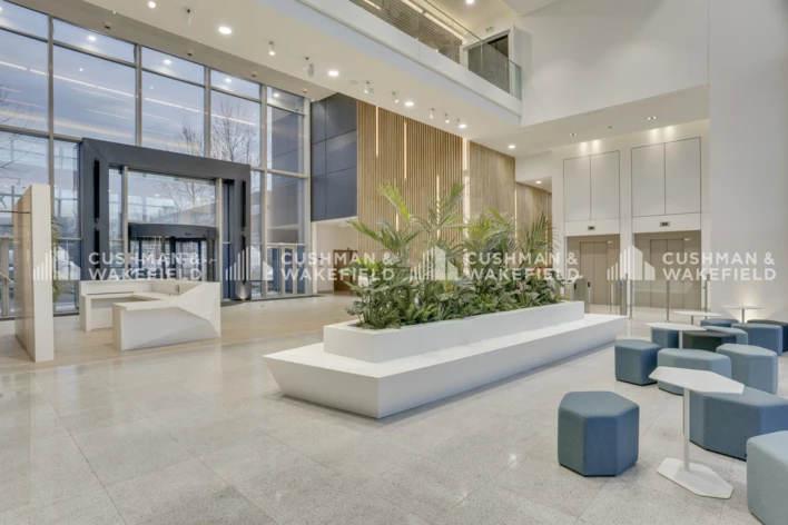 Prestations : faux plancher technique, climatisation réversible, luminaires LED, hauteur sous plafond de 2,70 m, trame de façade de 1,35 m, certification BREEAM In-Use Very Good garantissant un excellent confort environnemental.