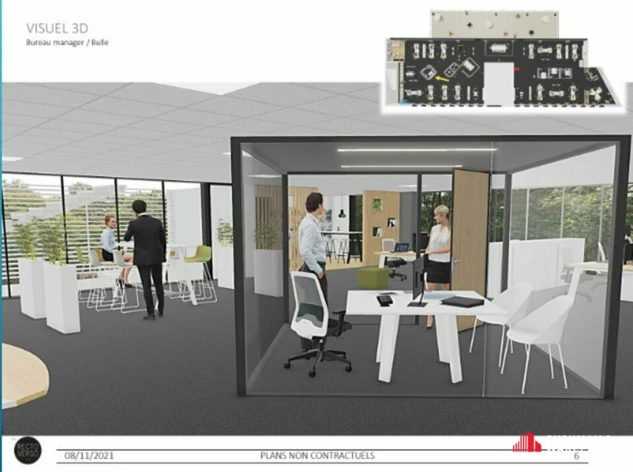 Deux plateaux de 1 101 m2 m² au R+1 et R+2, et 1 075 m² en R+3, livrés aménagés non cloisonnés.