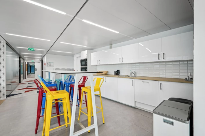 Le plateau dispose de prestations techniques abouties avec un faux plancher, un faux plafond intégrant un éclairage LED homogène et des cloisons vitrées, assurant une belle qualité de lumière naturelle dans les espaces. L'un des plateaux est doté d'une cuisine, pratique pour les collaborateurs.