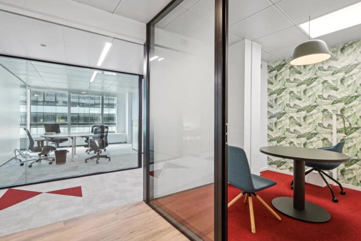 Les espaces bénéficient d'un cloisonnement de qualité et d'un aménagement technique soigné avec faux plancher, faux plafond et éclairage LED, garantissant un confort de travail quotidien. Les cloisons vitrées laissent entrer une lumière naturelle abondante, rendant les bureaux particulièrement agréables à vivre. Selon les surfaces, une cuisine est déjà en place, idéale pour les équipes souhaitant prendre leurs repas sur place.