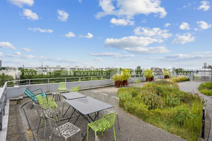 L'immeuble dispose d'une multitude de services pour ses locataires : RIE, cafétéria, conciergerie, salles de réunions mutualisées et entièrement équipées, espaces extérieurs, terrasse avec vue sur la Tour Eiffel et La Défense, auditorium, vestiaires avec douches, etc.