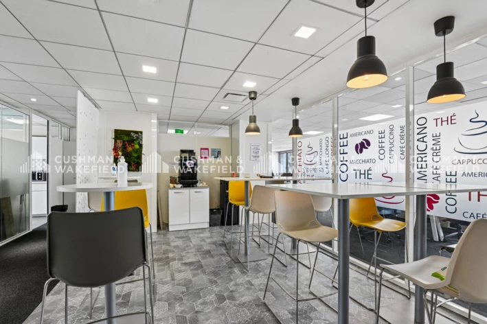 Le 2? étage est aménagé pour favoriser la productivité et la collaboration. Il comprend deux grands open spaces, un bureau individuel, une salle de réunion, ainsi qu'une cuisine moderne avec un espace cafétéria convivial pour les pauses et les échanges entre collaborateurs.
