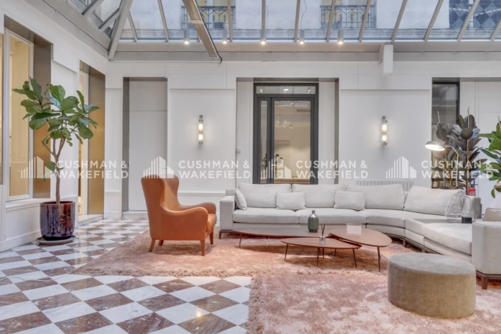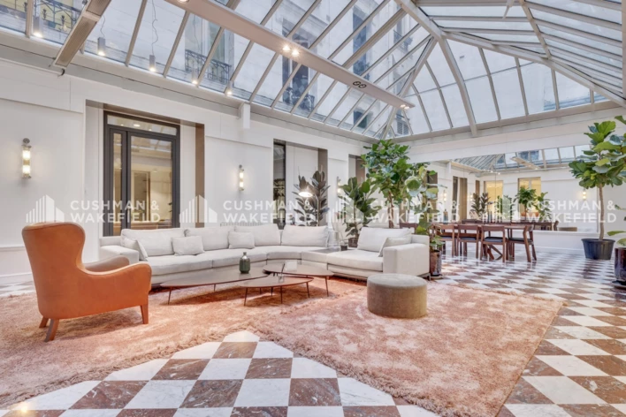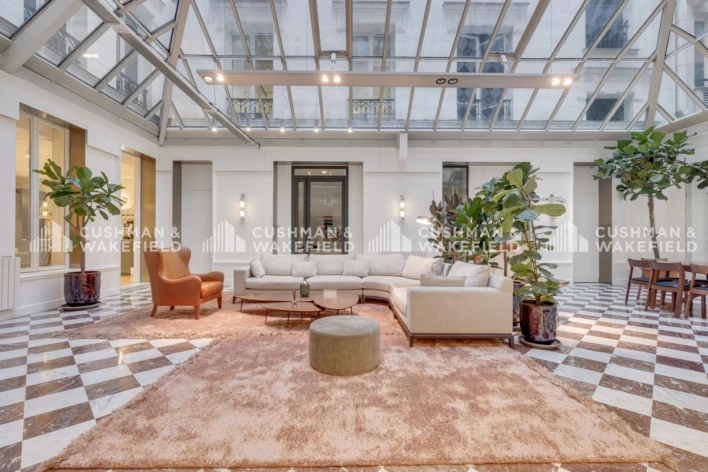 Passé le porche, vous serez de suite attiré par le magnifique espace commun sous verrière autour duquel sont disposés espaces de de convivialité et salles de réunion.