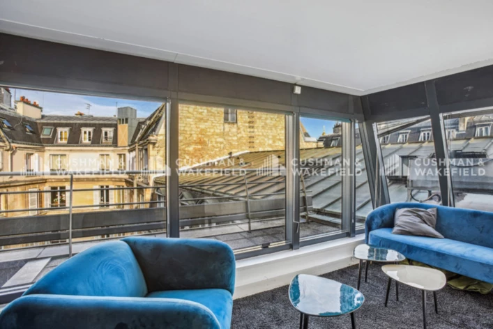 Au 7ème étage, découvrez une grande salle de réception avec espace cuisine de 84m² qui sera entièrement rénovée. De plus, vous bénéficiez d'un accès privatif à un double rooftop aménagé et arboré avec vue dégagée sur les toits de Paris.