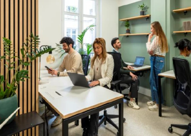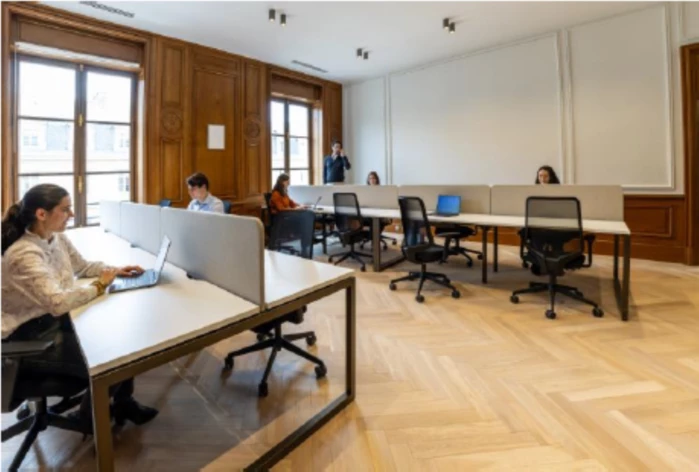 Traversant et baigné de lumière naturelle, cet espace modulable est pensé pour le flex office et offre une capacité de 76 postes, quatre salles de réunion, sept phonebooths ainsi qu'une cuisine avec espace convivialité.