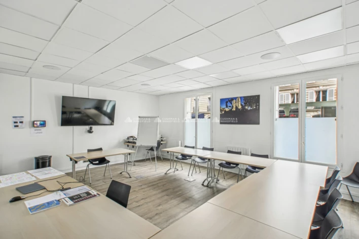 L'aménagement propose plusieurs espaces de travail ainsi que de grandes salles idéales pour des réunions ou des formations. Un espace détente avec cuisine, situé en sous-sol, complète l'ensemble.