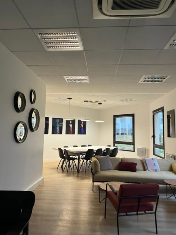 Situés au 6e étage, ces bureaux bénéficient d'une excellente luminosité et offrent un cadre de travail confortable et fonctionnel. Les parties communes de l'immeuble comprennent une cafétéria avec frigo connecté ainsi qu'un espace lounge partagé, propice aux échanges et à la détente.