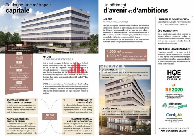 Situé à l'entrée principale de la ZAC de Saint-Martin-Du-Touch, à seulement 15 minutes du centre ville de Toulouse et au cur du pôle aéronautique, AIR ONE marque l'arrivée dans une zone dédiée aux entreprises.