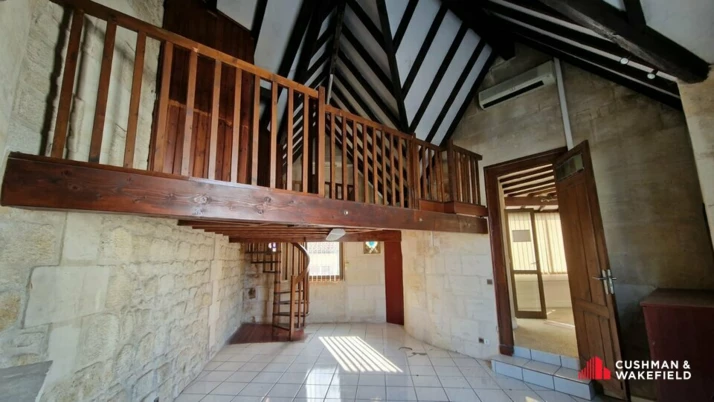 Prestations architecturales atypiques (pierres de taille, poutres en bois, carrelage damier noir et blanc notamment).