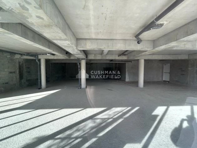 Un local commercial d'une surface de 213 m² neuf à réserver, livré brut de béton avec fluides en attente, menuiseries et vitrines posées.