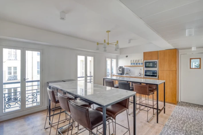 Nous vous proposons des solutions de bureaux opérés dans un immeuble Haussmanien, mêlant des intérieurs contemporains au plaisir de profiter d'un jardin d'hiver.