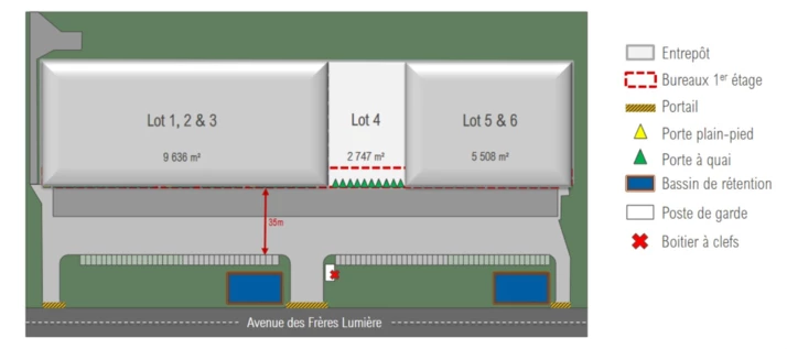Situé dans un environnement dynamique, l'entrepôt bénéficie d'une zone de manoeuvre facilitant l'accès aux poids lourds et d'un espace extérieur pouvant accueillir des stationnements ou des zones de stockage complémentaire.