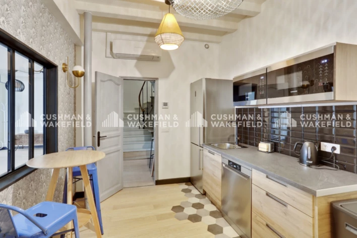 Cet espace de bureaux atypiques dispose de très beaux volumes, d'un espace détente, deux salles de réunion et d'une terrasse.