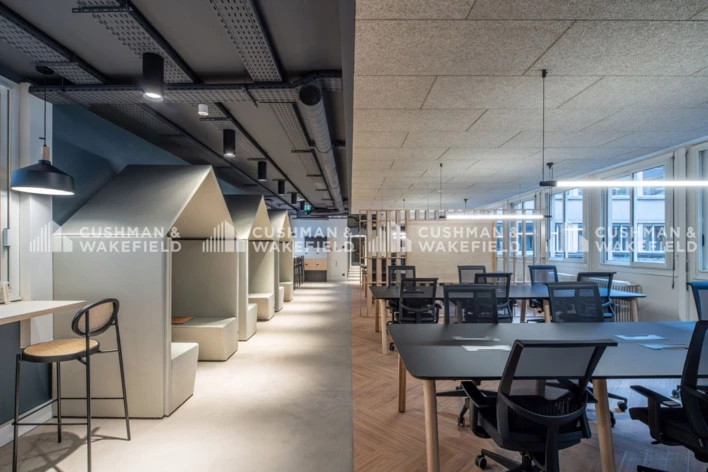 Optez pour la flexibilité immobilière à Paris 8 au sein d'un espace de travail en marque blanche loué en prestation de services et entièrement aménagé par notre partenaire avec des tons chaleureux et ultra modernes.